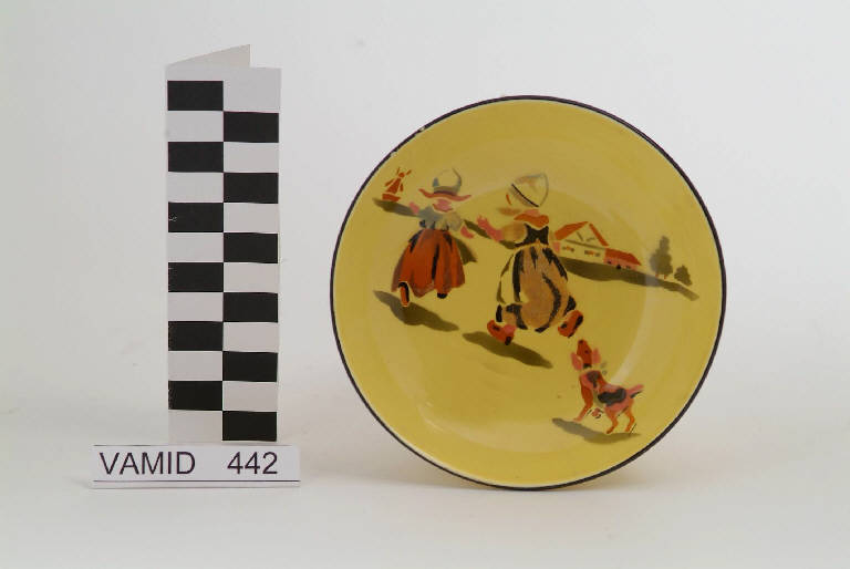 Ciotola circolare; fondo giallo decorato con paesaggio olandese in rosa, arancio, marrone, azzurro e verde; bordo rifinito con filettatura nera.