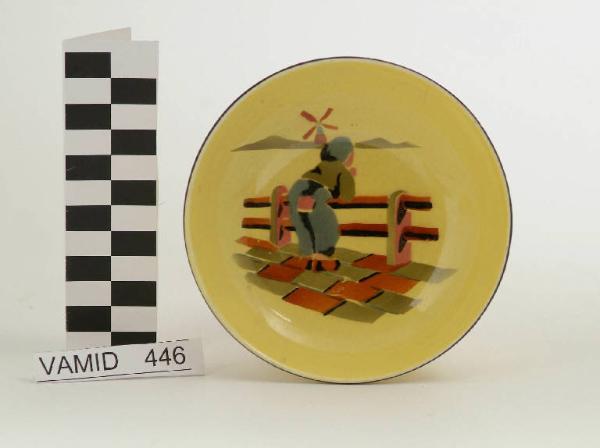 Ciotola circolare; fondo giallo decorato con paesaggio olandese in rosa, arancio, marrone, azzurro e verde; bordo rifinito con filettatura nera.