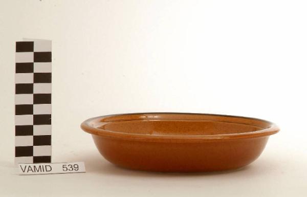Pirofila circolare; bordo estroflesso, fondo marrone con piccoli granelli neri; bordo rinito in nero.