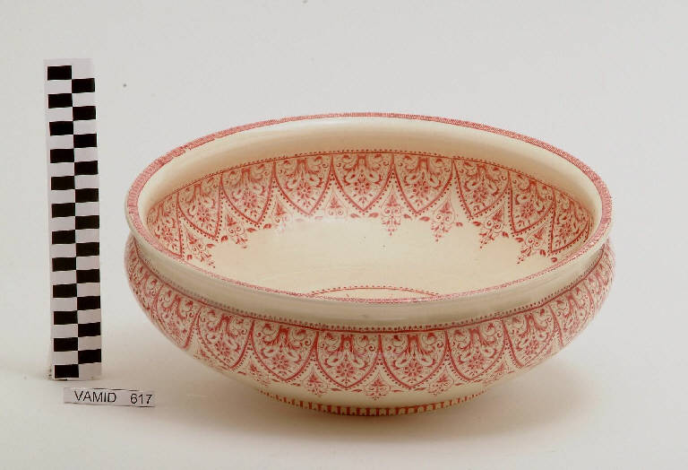 Catino lavamano con bordo estroflesso; fondo color avorio con motivi decorativi geometrici e vegetali in rosso all'interno e all'esterno.