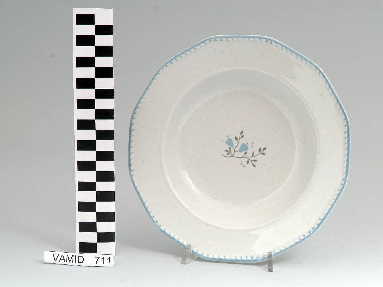 Piatto fondo con tesa angolata; motivo a corda sul bordo esterno e dentellatura sul bordo interno; fondo bianco con motivo vegetale stilizzato in grigio e azzurro al centro del cavetto; bordo rifinito in azzurro.