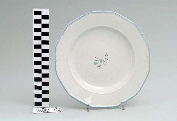 Piatto piano con tesa angolata; motivo a corda sul bordo esterno e dentellatura sul bordo interno; fondo bianco con motivo vegetale stilizzato in grigio e azzurro al centro del cavetto; bordo rifinito in azzurro.