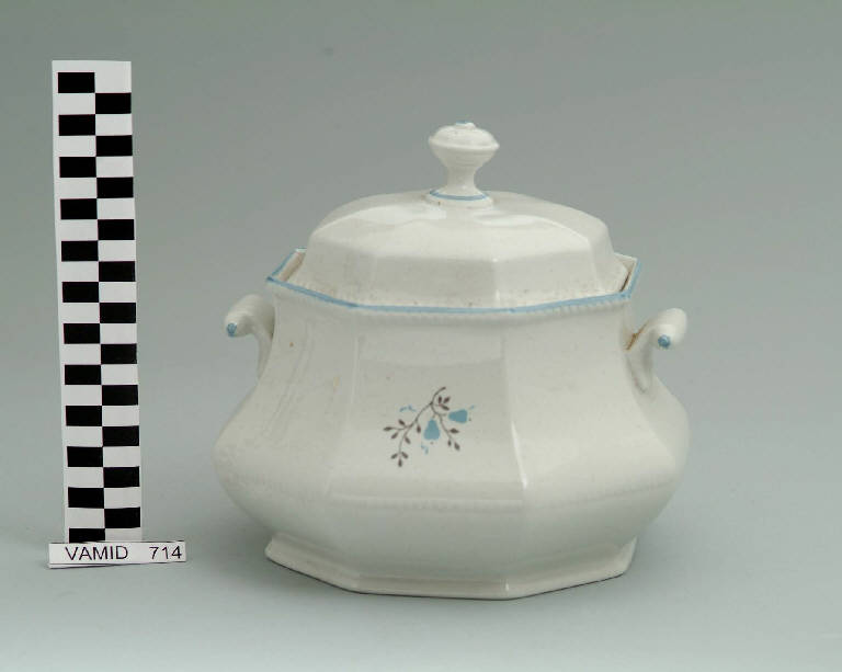 Zuppiera a sezione ottagonale con restringimento in prossimità del piede; manici a ricciolo; motivo a corda sull'orlo e dentellatura prima del piede; fondo bianco con motivo vegetale stilizzato in grigio e azzurro all'esterno; coperchio a sezione ottagonale con pomolo apicale; bordi rifiniti in azzurro.
