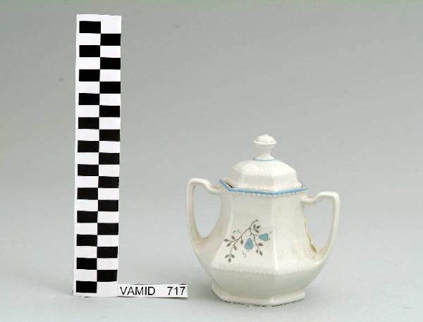 Zuccheriera a sezione esagonale con restringimento in prossimità del piede; manici mistilinei; motivo a corda sull'orlo e dentellatura prima del piede; fondo bianco con motivo vegetale stilizzato in grigio e azzurro all'esterno; coperchio a sezione esagonale con pomolo apicale; bordi rifiniti in azzurro.
