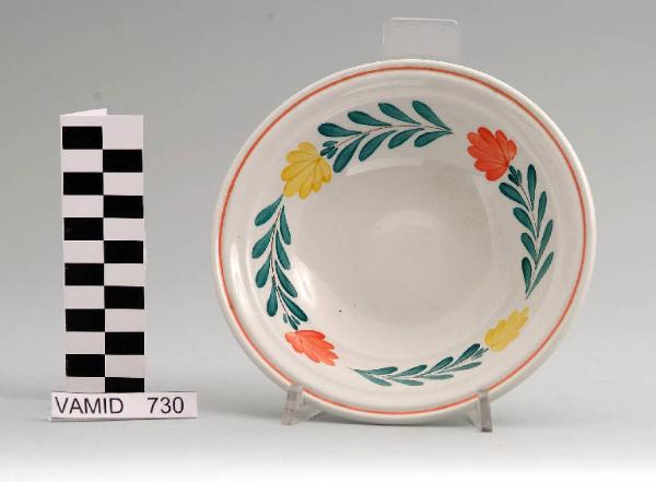 Piatto fondo circolare senza tesa; fondo bianco con motivo decorativo vegetale lungo l'ala in verde, giallo e arancio; bordo rifinito in arancio.