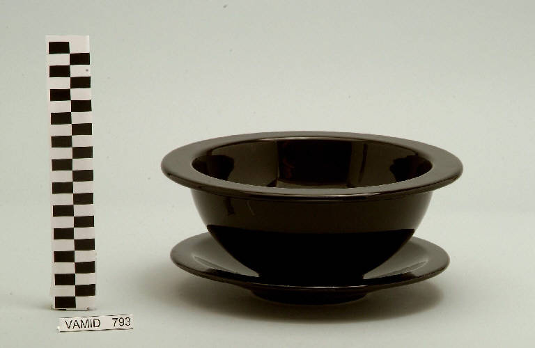 - NOTIZIE STORICO CRITICHE La zuppiera, appartenente ad un servizio da tavola (nn. inv. 789-796), è realizzata nella forma "Saturno". Il design essenziale e funzionale indica una datazione ormai avanzata nel Novecentro. Come riporta il cartellino applicato, l'oggetto in esame venne realizzato nel 1970 dalle Ceramiche Pareschi in collaborazione con Albino Reggiori. L'artista lavenese cominciò a fare ceramica nel 1955 ma fu dopo il 1981 che la sua ricerca si sviluppò prevalentemente nel campo ceramistico, in modo particolare sui materiali ceramici legati alla propria terra. Tipologicamente l'oggetto in esame si lega ad un servizio da caffè (nn. inv. 784, 786, 800-803) e ad un servizio da thè (nn. inv. 785...804) conservati nel Museo delle Terraglie di Laveno.