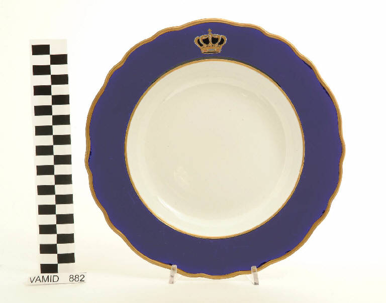 Piatto fondo con orlo festonato; fondo bianco avorio; tesa in colore blu Sevrès con corona del Regno d'Italia; bordo rifinito con filettatura oro.