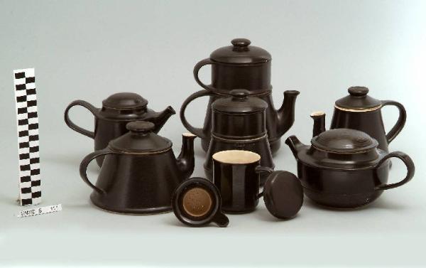 - NOTIZIE STORICO CRITICHE La teiera, appartenente ad un servizio da thè (nn. inv. 948...970), si lega tipologicamente ad un servizio da caffè (nn. inv 947, 951-953) e ad una tazza da tisana (num. inv. 949). La presenza nel marchio del nome "Bucci" indica che l'oggetto in esame venne prodotto dopo che il Laboratorio Pesaro passò sotto la direzione tecnico-artistica dello stesso Bucci e sicuramente prima della mostra "Terra & Terra uno. Qualità e ricerca nella piccola serie", organizzata nel Museo di Laveno nel 1982, nella quale venne esposto. All'acquisto contribuì il "Lions Club" di Laveno Mombello.