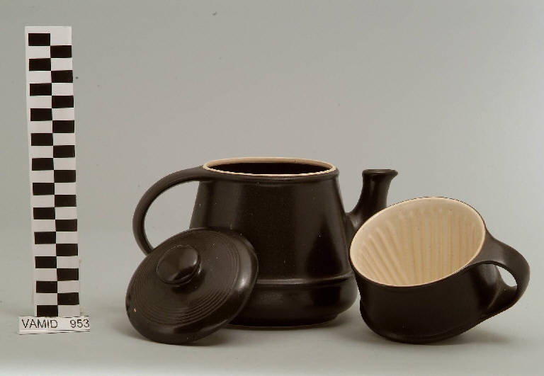 Caffettiera con base circolare; beccuccio sporgente; manici a "C"; coperchio circolare con pomolo apicale; filtro; fondo nero opaco.