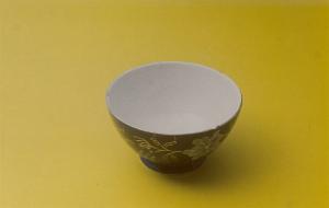 Ciotola di colore blu a sezione circolare con piede arrotondato. Decorazione a motivo vegetale con fiori e tralci vitinei nei colori oro e bianco.