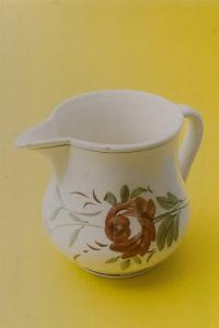 Brocca da tavola bianca decorata con disegni floreali in rosa e verde; filettatura bruna lungo l'imboccatura e lungo il piede. Manico liscio.