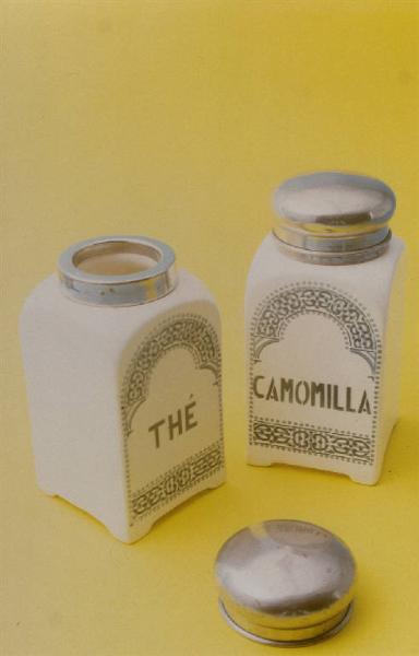 - NOTIZIE STORICO CRITICHE Il carattere 'architettonico' e la stilizzazione degli ornati presenti sul barattolo (che si accompagna a un recipiente analogo per la camomilla; cfr. inv. n. 1090) indicano una tangenza con lo stile Liberty d'inizio Novecento, datazione non contraddetta dal tipo di carattere scelto per l'iscrizione. Nella fotografia l'oggetto in esame è quello a sinistra.