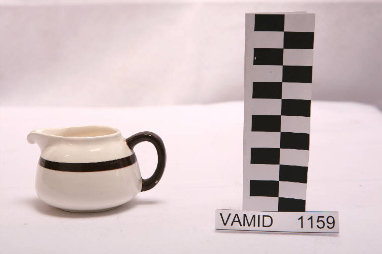 - NOTIZIE STORICO CRITICHE La lattiera fa parte insieme una zuccheriera, anch'essa conservata al MIDC (inv. n. 1158), di un servizio da thè databile alla metà del secolo scorso. Le forme presentano un'accentuata semplificazione sottolineata sul fondo bianco dalla fascia marrone orizzontale che è l'unico decoro dell'oggetto, oltre alla smaltatura marrone del manico.