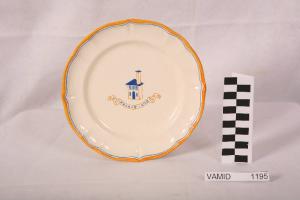 Piatto da frutta circolare con tesa ondulata e bordo leggermente arcuato e modellato con una profilatura incisa; di colore bianco avorio con disegno sul fondo nei colori giallo carico e blu raffigurante una casa con lungo comignolo e un cartiglio sottostante con iscrizione; tesa bordata di giallo carico e profilatura in blu.