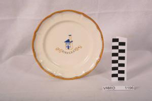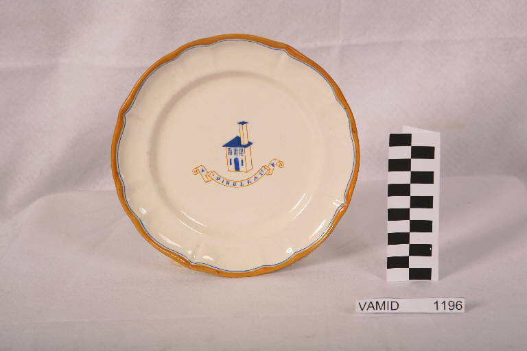 Piatto da frutta circolare con tesa ondulata e bordo leggermente arcuato e modellato con una profilatura incisa; di colore bianco avorio con disegno sul fondo nei colori giallo carico e blu raffigurante una casa con lungo comignolo e un cartiglio sottostante con iscrizione; tesa bordata di giallo carico e profilatura in blu.