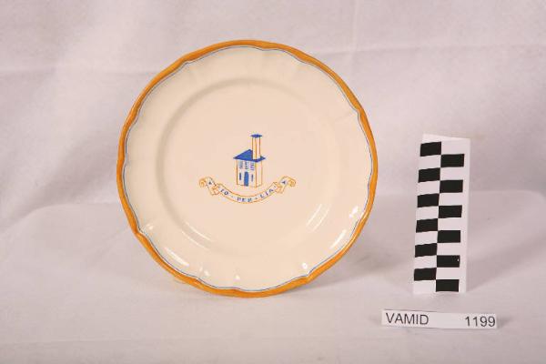 Piatto da frutta circolare con tesa ondulata e bordo leggermente arcuato e modellato con una profilatura incisa; di colore bianco avorio con disegno sul fondo nei colori giallo carico e blu raffigurante una casa con lungo comignolo e un cartiglio sottostante con iscrizione; tesa bordata di giallo carico e profilatura in blu.