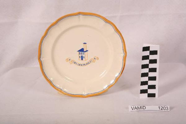 Piatto da frutta circolare con tesa ondulata e bordo leggermente arcuato e modellato con una profilatura incisa; di colore bianco avorio con disegno sul fondo nei colori giallo carico e blu raffigurante una casa con lungo comignolo e un cartiglio sottostante con iscrizione; tesa bordata di giallo carico e profilatura in blu.