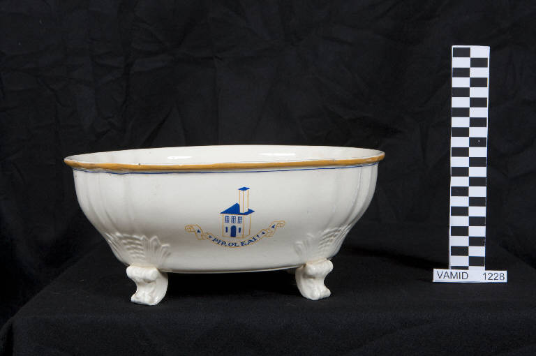 - NOTIZIE STORICO CRITICHE L'insalatiera fa parte di un servizio da tavola composto di undici piatti da frutta, quindici piatti piani, sette piatti fondi, due piatti da portata, una salsiera, una formaggera, una zuppiera e una insalatiera (inv. nn. 1195-1205, 1223-1237, 1239-1249, 1258). Il servizio è realizzato nella forma Vecchia Milano con decoro ideato dall'architetto milanese Piero Portaluppi in omaggio alla moglia Lia Baglia, sposata nel 1913. Il servizio, denominato "Piero e Lia", presenta infatti il disegno di una casa, simbolo della famiglia e del focolare e anche dell'attività di architetto del Portaluppi, e un cartiglio con sei iscrizioni diverse, tutte anagrammi di "Piero e Lia", che si alternano sui vari oggetti. Gli anagrammi ("Pria e l'io", "Piroleai!", "Io per Lia", "Ire al poi", "Pari o' lei", "O' iperali") sono talvolta licenze poetiche, quasi dei 'non sense', ma proprio per questo introducono a un mondo privato e amorevole fatto di un'intesa esclusiva, e in questo sta il fascino di questa invenzione di Portaluppi. L'architetto fu spesso attivo per Laveno-Mombello, ma soprattutto negli anni venti, quando eseguì uno studio per un albergo (1922), il villino per il direttore della Società Ceramica Italiana (1923), il Parco della Rimembranza, lo Stabilimento della Società Ceramica Italiana in via Buozzi (1924-1926), il progetto per lo stabilimento Verbano in via XXV aprile (1924) e il progetto per l'ampliamento del cimitero (1925).\nFigura poliedrica, attiva anche nei campi del disegno, della vignetta e del design, il Portaluppi si cimentò nella progettazione di ceramiche per la S.C.I. (di cui fu anche il direttore artistico) come il superbo vaso in blu cobalto con decori in oro del 1923 (in. nn. 1861-1862) tuttora conservato in una sala del museo e in questo originalissimo servizio, databile ancora agli anni venti. Proprio in quegli anni Portaluppi manifestò in un'altra occasione il gusto per gli anagrammi: nel 1926, incaricato del Piano Regolatore di Milano insieme a Marco Semenza, chiamò il Piano "Ciò per amor" dal nome di entrambi.