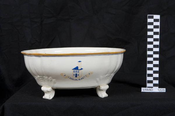 Insalatiera di forma ovale con quattro piedini a volute a "C" con motivi vegetali; corpo sagomato con motivi a ventagli a rilievo sopra l'attacco dei piedini; colore bianco avorio con disegno di una casa con lungo comignolo ripetuto sui due lati nei colori giallo intenso e blu; bordi rifiniti in giallo e blu.