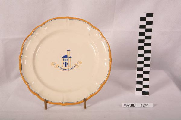 Piatto piano circolare con tesa ondulata e bordo leggermente arcuato e modellato con una profilatura incisa; di colore bianco avorio con disegno sul fondo nei colori giallo carico e blu raffigurante una casa con lungo comignolo e un cartiglio sottostante con iscrizione; tesa bordata di giallo carico e profilatura in blu.