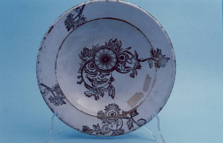 - NOTIZIE STORICO CRITICHE Si tratta di un esempio curioso di produzione in terraglia decorata a decalcomania: considerata l'asimmetria e l'illogicità nella disposizione del decoro, che rimane interrotto lungo il profilo del piatto, potrebbe forse trattarsi di un esemplare realizzato per prova. Il marchio presente a tergo indica che l'oggetto venne prodotto nello stabilimento di Mondovì.