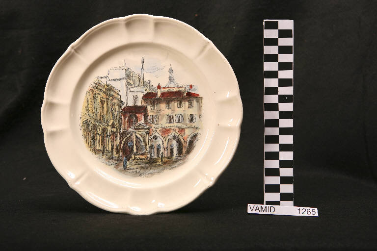 - NOTIZIE STORICO CRITICHE La forma del piatto è detta "Vecchio Milano". Al centro è dipinta a mano la veduta di Piazza Mercanti a Milano di origine medioevale (se ne hanno notizie a partire dalla metà del XIII secolo). La scritta "Vellani Marchi" sotto la base del piatto indica il pittore inventore delle immagini. Artista modenese trasferitosi a Milano nel 1925, Mario Vellani Marchi si dedica allo studio di vedute di città. Muore nel capoluogo lombardo nel 1979.