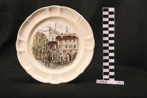 Piatto piano color avorio con bordo a rilievo decorato al centro con Veduta di Milano.
