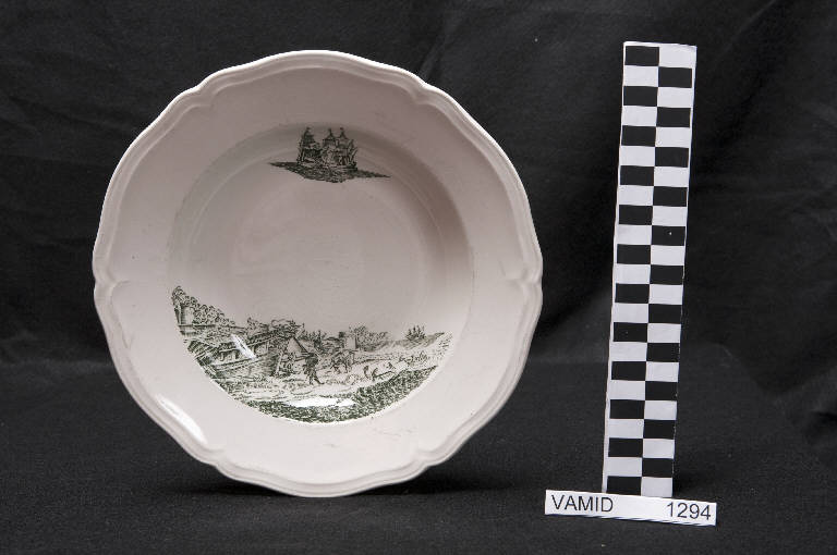 Piatto fondo con orlo sagomato a rilievo; fondo bianco avorio con scena di battaglia in paesaggio marino in posizione decentrata in verde.