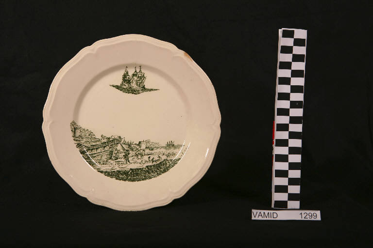 Piatto piano con orlo sagomato a rilievo; fondo bianco avorio con scena di battaglia in paesaggio marino in posizione decentrata in verde.