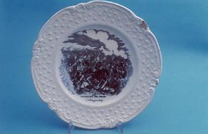 - NOTIZIE STORICO CRITICHE Il piatto in esame, facente parte di un servizio da dodici (nn. inv. 1616-1627), è stato prodotto dalla Richard indicativamente tra gli anni '60 e '70 dell'Ottocento. La formula completa del punzone a tergo, oggi solo parzialmente leggibile, è "RICHARD SON BARONA". Secondo il Morazzoni (cfr. "La terraglia italiana", 1956 ?) questo marchio venne impresso solo fino al 1848. Le scene nei cavetti, raffiguranti episodi della storia italiana avvenuti tra il 1859 e il 1860, sono evidentemente più tarde: la presenza di una di esse in un piatto prodotto dalla Richard tra il 1859 e 1870 nello stabilimento di San Cristoforo (cfr. "La terraglia italiana", p. 148) ipotizza una datazione coeva. E' quindi possibile che nello stabilimento di Barona, una località vicino Milano, sia rimasta una giacenza di piatti poi ripresi e dipinti tra gli anni '60 e '70. Nel cavetto del piatto in esame è raffigurato, attraverso la tecnica della decalcomania sottosmalto in monocromo color nero, il passaggio del Ticino da parte delle truppe francesi avvenuto il 3 giugno 1859.