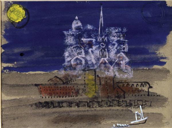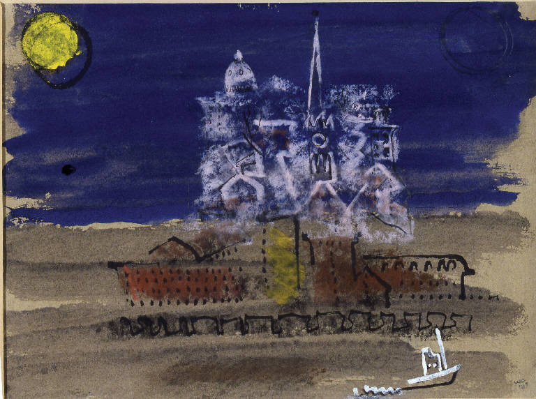 - NOTIZIE STORICO CRITICHE Congdon, appena ritornato alla città natale, sembra volerla celebrare in due vedute che evocano nella tecnica e nello spirito la magia degli acquarelli kleeiani. Nella prima, Providence the Port (a), la città si accampa al centro della composizione divisa in due dalla linea di orizzonte, per cui l'abitato risulta parimenti diviso in due metà: nella parte inferiore corre il fregio orizzontale dei sordidi quartieri portuali, mentre la "città alta" è una epifania dorata, quasi sospesa nel cielo azzurro intenso con le cupole e le torri dei suoi monumenti civili e religiosi. La veduta è per così dire incorniciata da due motivi che si richiamano con una forte tensione simbolica: il disco in alto a sinistra e la navicella in basso a destra.