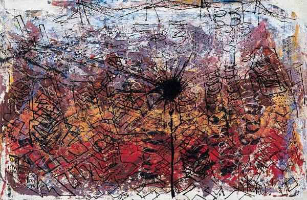- NOTIZIE STORICO CRITICHE L'opera, firmata e datata, con l'aggiunta della scritta «N.Y.», è stata dipinta dall'appartamento di Park Avenue dove Congdon si era trasferito nell'estate del '48. Il punto di vista è molto alto rispetto alla città: la "all-over composition" lascia spazio ad un lontanissimo orizzonte, ancorché chiuso dalla struttura metallica di un ponte che corona il bordo superiore del dipinto con una sorta di motivo ornamentale. Il reticolato di linee smarrisce ogni regolarità, sostituito da tratteggi a forma di spirale che conferiscono all'assetto una sorta di movimento verso l'alto, apparentemente generato da una macchia d'inchiostro nero, quasi uno schizzo di penna, anticipatorio della successiva adozione del "dripping", gettato a cancellare la città sottostante. Come di consueto l'artista utilizza l'inchiostro in funzione eminentemente grafica tracciando il nervoso contorno di edifici e strade che si sovrappone e contrappone alla massa cromatica sottostante, dalle tinte particolarmente violente.