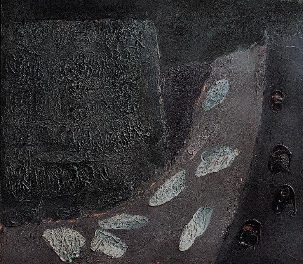 - NOTIZIE STORICO CRITICHE Il dipinto si colloca al termine della lunga serie di segni ispirati al recente viaggio in India e ricollegabili alle vedute urbane degli anni '50: sulla destra, una doppia banda rappresenta la prospettiva incurvata di strada e marciapiede, dove sembrano muoversi in direzioni opposte macchine nere e grigi grappoli di persone simili a larve; sulla sinistra domina l'imponente facciata di un edificio finemente lavorata dalla spatola. Per il resto, il lavoro di incisione è ridotto al minimo, mentre le stesure del colore mescolato a cenere sono accordate su una comune tonalità grigio-argentea. La vasta area di nero opaco in alto, brusca interruzione della prospettiva di strada, accentua il carattere luttuosamente onirico dell'opera.