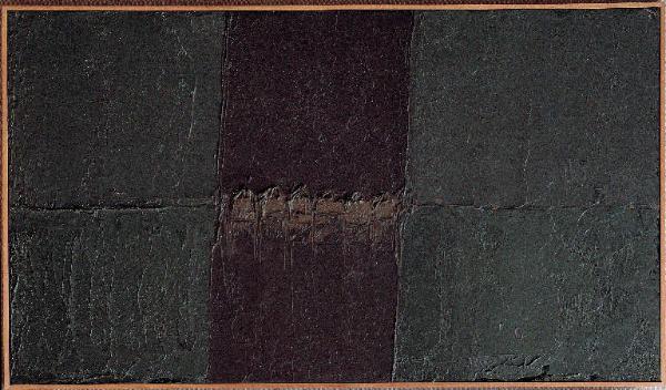 - NOTIZIE STORICO CRITICHE Eseguita il 2 aprile del 1976, "Iquitos - pioggia, 11" è ispirata al viaggio in Perù del gennaio: si tratta di una veduta delle baracche di Iquitos, sul Rio delle Amazzoni, nel pieno di un acquazzone equatoriale. Colpisce soprattutto l'impianto solenne e monumentale delle partizioni verticali e orizzontali: quanto a queste ultime, una linea separa il fiume in basso e il cielo in alto, due aree di colore ugualmente denso e opaco e molto vicine tra loro nelle tonalità grigo-verdi. Una seconda partitura, ortogonale alla prima, è introdotta al centro del quadro dalla banda color bruno che divide il pannello in tre ante. Al centro, nel punto in cui essa interseca la linea di orizzonte, sta la striscia dorata, simile a un miraggio, delle baracche sul fiume. Pur trovando collocazione in una sfera intimista, quest'opera spicca per una atmosfera profondamente inquietante.
