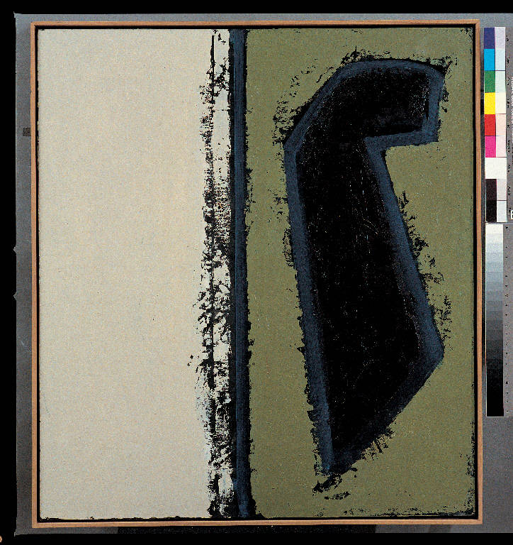 - NOTIZIE STORICO CRITICHE Complessa e tormentata è la genesi e la struttura di "Crocefisso (Campo G., 20)" del maggio 1987. Anch'esso è debitore di "Cielo Neve, 3" per la duplice banda centrale, nella quale corre una striscia di azzurro intenso. Emerge qui tuttavia una netta bicromia, poiché la campitura di destra è di un verde-grigio più direttamente allusivo alla realtà naturale. Ma il dato più rilevante è il successivo intervento della grande e inquietante forma nera bordata di azzurro, che rompe la silenziosa compattezza dell'area verde. Si apre così un dislivello nella stessa immagine in quanto una nuova forma, ben più inquietante e ingombrante plasticamente, viene a concorrere con la sobrietà della banda centrale nera e azzurra. Le sfrangiature nere nel colore - ottenute lavorando con la spatola poco carica di colore, un procedimento di cui l'artista in questa fase sa sfruttare bene le risorse - fungono da elemento di raccordo tra i diversi piani del dipinto.