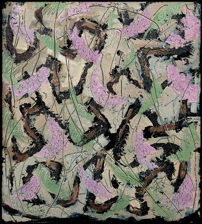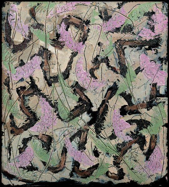 - NOTIZIE STORICO CRITICHE La primavera del 1988 è segnata dal ritorno del motivo floreale, precisamente del Glicine già affrontato cinque anni prima. L'artista vi ritorna tuttavia in un formato più ambizioso, cogliendo il fenomeno della fioritura nel suo aspetto lussureggiante. Ne deriva, in tutte le numerose versioni, una caratteristica composizione all over, che fa pensare a una rivisitazione in chiave naturalistica della più classica astrazione Action Painting. Ugualmente importante il ruolo del fondo nero che interagisce con i colori, accentuandone la luminosità ma anche assumendo una positiva funzione plastica. Glicine, 10, immediatamente successivo al numero 9, ha un formato più monumentale e mostra una volontà di ordinare i colpi di spatola in uno schema più regolare, grazie soprattutto alla intelaiatura zigzagante dei rami, cui le macchie nere del fondo conferiscono una rilevanza plastica più marcata.