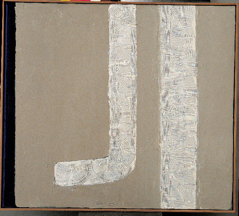 - NOTIZIE STORICO CRITICHE Il ritorno delle nebbie invernali riconduce l'artista alle sperimentazioni di quasi due anni prima: su di un fondo sostanzialmente monocromo - di un grigio scaldato di giallo - si apre una banda verticale in cui riconosciamo i "blips" di Barnett Newman, artista con la cui opera Congdon sembra in questi anni impegnato in un serrato dialogo. Dialogo che è evidente in "J Bianco", dove la verticale nera è sostituita da una bianca, cui però l'artista, con un intervento non deliberato, ne accosta una seconda che si incurva a formare una "J" (ma in realtà il segno richiama il classico motivo angolare del canaletto ripetuto in molte opere, soprattutto a pastello, e divenuto una sorta di monogramma). L'intervento dell'incisione sembra voler scongiurare una deriva troppo spinta verso l'astrazione, riproponendo il consueto tessuto dei campi e dei filari d'albero.