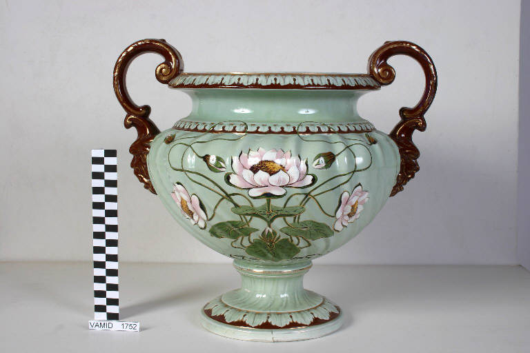 Vaso ad anse di colore verde-grigio chiaro e marrone. Piede circolare con raccodo concavo; anse a doppia voluta contrapposta con raccordi a mascherone; corpo policromato a ninfee dipinte soprasmalto. Lumeggiature in oro brillante eseguite a terzo fuoco.