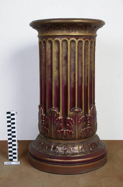 Piedistallo a colonna scanalata con base fasciata di foglie di acanto. Decorazione di color porpora eseguita a terzo fuoco con lumeggiature in oro zecchino eseguite a mano. Rifinitura a lustro metallico.