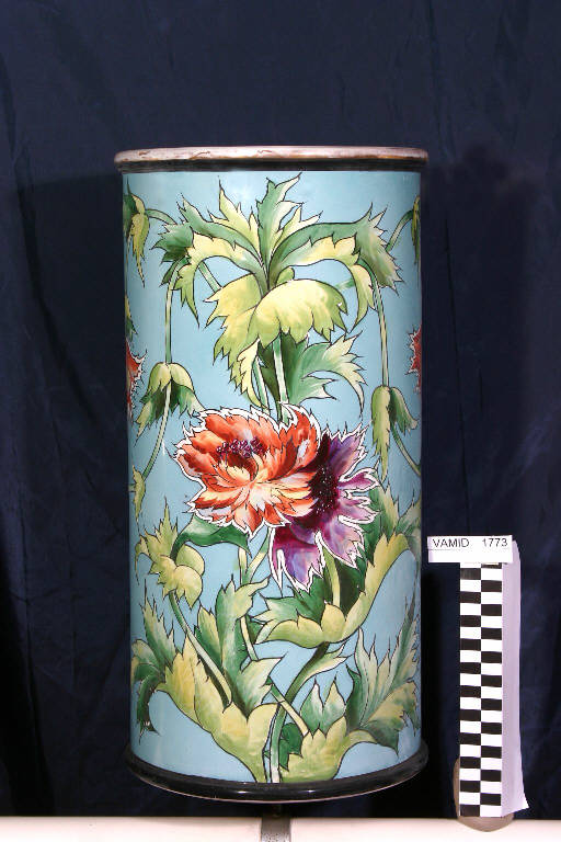 Portaombrelli cilidrico con bordo inferiore nero e bordo superiore oro (molto sbiadito). Parte frontale decorata a fiori e foglie di cardo con contorni in nero su fondo azzurro.