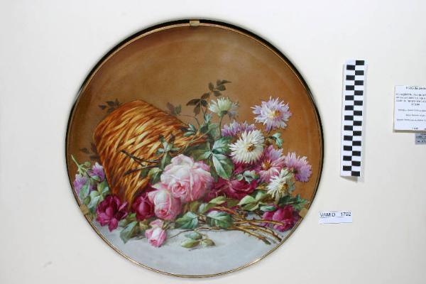 Grande piatto artistico con natura morta su sfondo color marrone. Bordo rifinito in oro brillante.