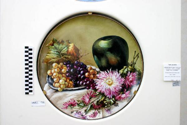 Grande piatto artistico con grappoli d'uva, crisantemi e vaso su sfondo color marrone chiaro sfumato. Profilatura sull'orlo in oro brillante.