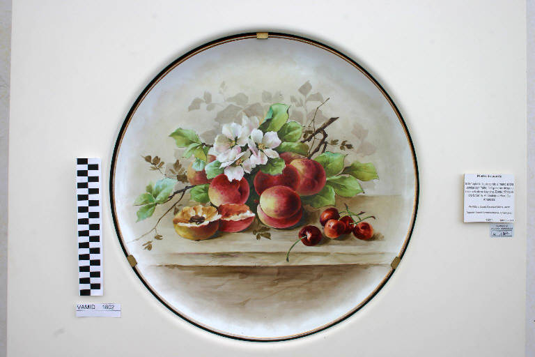 Grande piatto artistico con natura morta con frutta e fiori su sfondo beige. Rifinitura in oro brillante sull'orlo del piatto.
