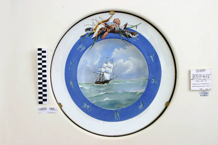 Grande piatto ornamentale con marina incorniciata da fascia circolare con segni zodiacali sormontata da trionfo di pesci e crostacei. Ala (o tesa) bianca.