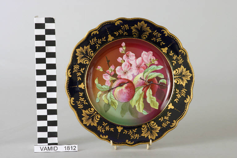 Piatto decorato al centro con frutti e fiori su sfondo sfumato verde-marrone-viola. Tesa del piatto di colore blu cobalto con decorazioni vegetali stilizzate in oro brillante.