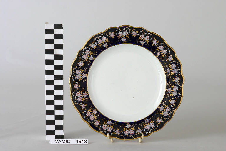 Piatto da frutta con fondo bianco e tesa decorata con roselline e piccole ghirlande di fiorellini in bianco, rosa e oro su fondo blu cobalto. Orlo ondulato rifinito in oro brillante.