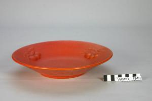 Scodella decorata con frutti a rilievo nella pasta e interamente smaltata in rosso-arancione (color aragosta).