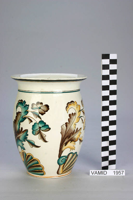Vaso da conserva leggermente panciuto con orlo estroflesso. Colori verde, marrone e giallo su fondo bianco.