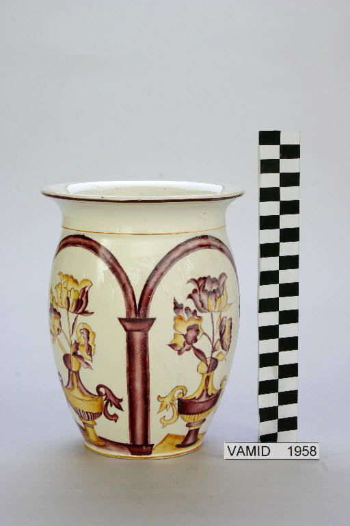 Vaso da conserva leggermente panciuto con orlo estroflesso. Colori giallo e marrone sfumati su fondo bianco.