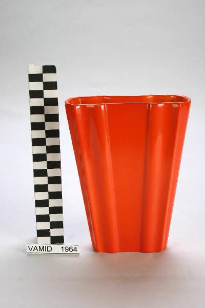 Vaso a sezione rettangolare sagomata, decorato con smalto arancio all'esterno e all'interno.